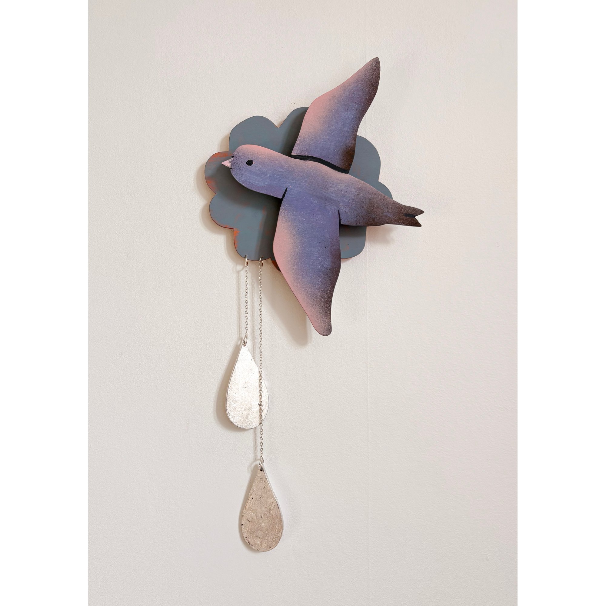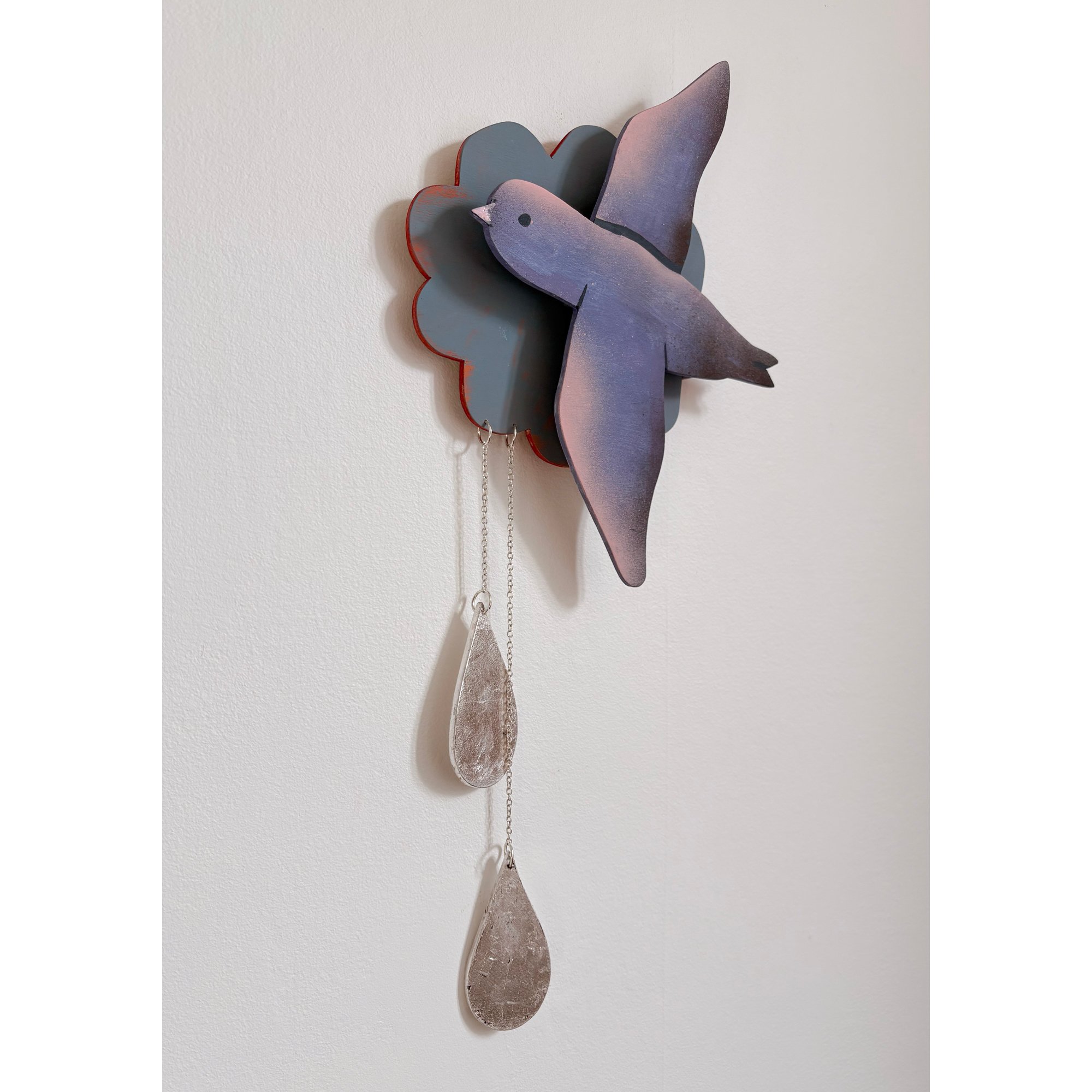 Hand-cut, painted and stamped wood makes every item unique. This bird has two silver leaf drops hanging in chains.